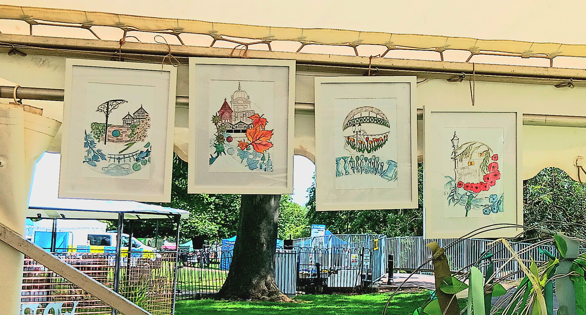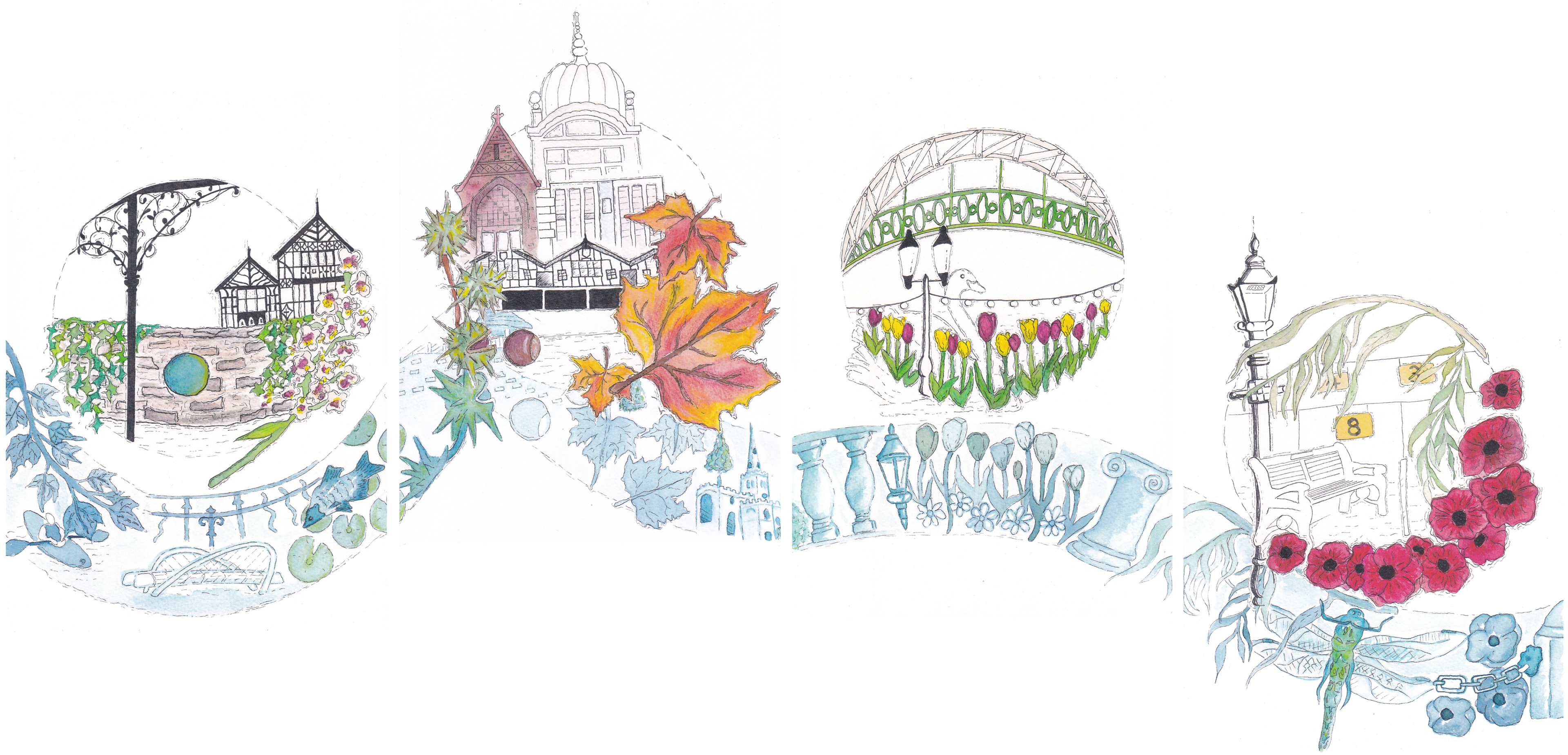 I created four illustrations, with each piece reflecting different reasons why people walk along the river through various scenes, buildings, plants and wildlife that are seen as they take their journey along.